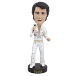 This beautiful Elvis piece, officially licensed by Elvis Presley Enterprises, is one of the highest quality pieces that Royal Bobbles has ever produced. In this design, the King of Rock is wearing his famous American Eagle jumpsuit. Each stone and stud is meticulously hand-sculpted and hand-painted. And the entire bobblehead comes securely packaged in a colorful collector's box.