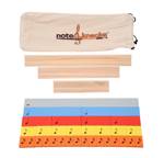 The base board depicts compass directions, clock face, and key on the back. The wooden, manipulative pieces are color-coded to the Note Knacks, and display note/fraction/degrees on one side and the corresponding rest/percentage on the other side. You also receive a DVD of sample rhythms to get your students started on rhythmic compositions.